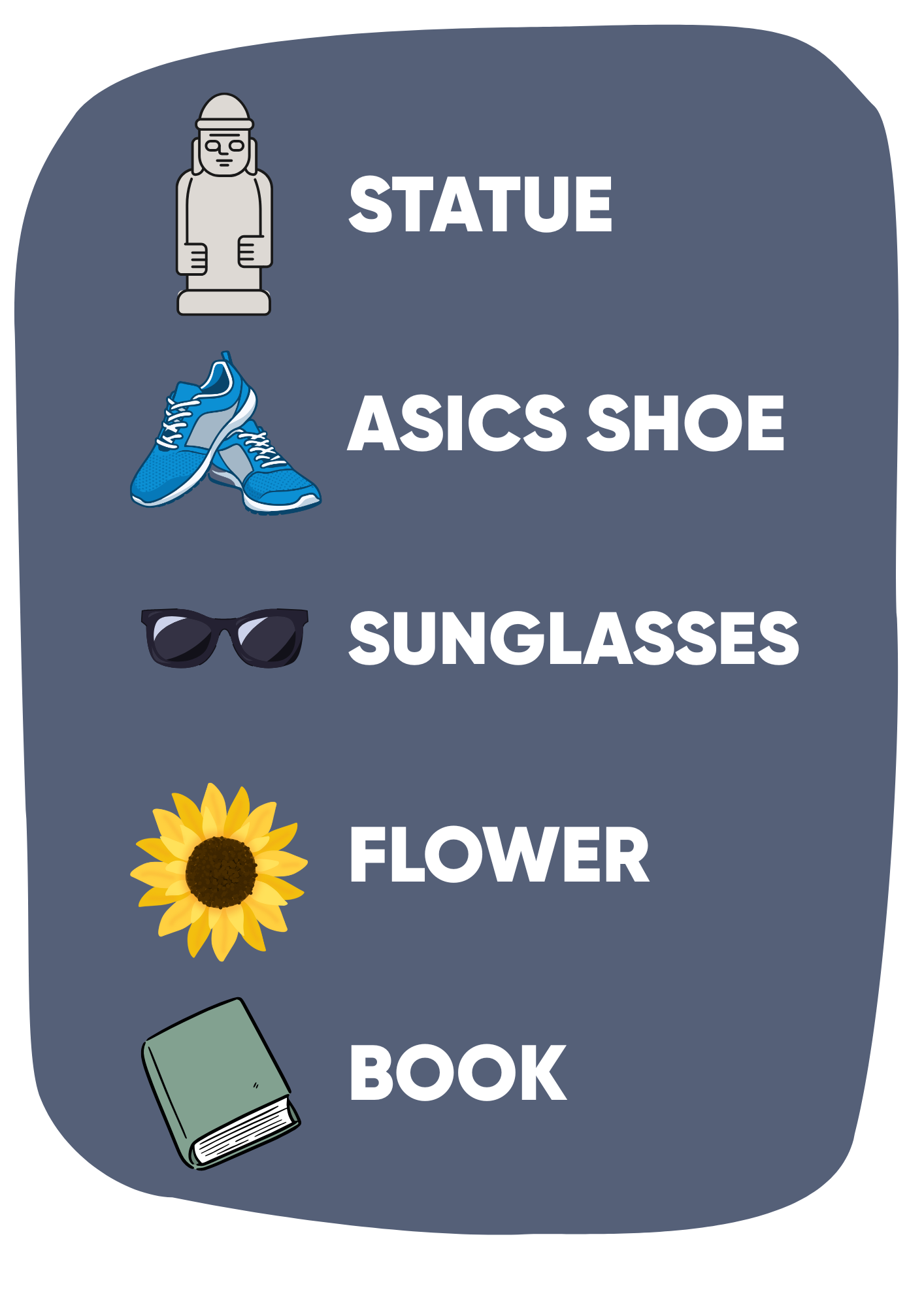 Can you get the following objects all in one photo? Failure to do this will result in a 10 minute penalty.