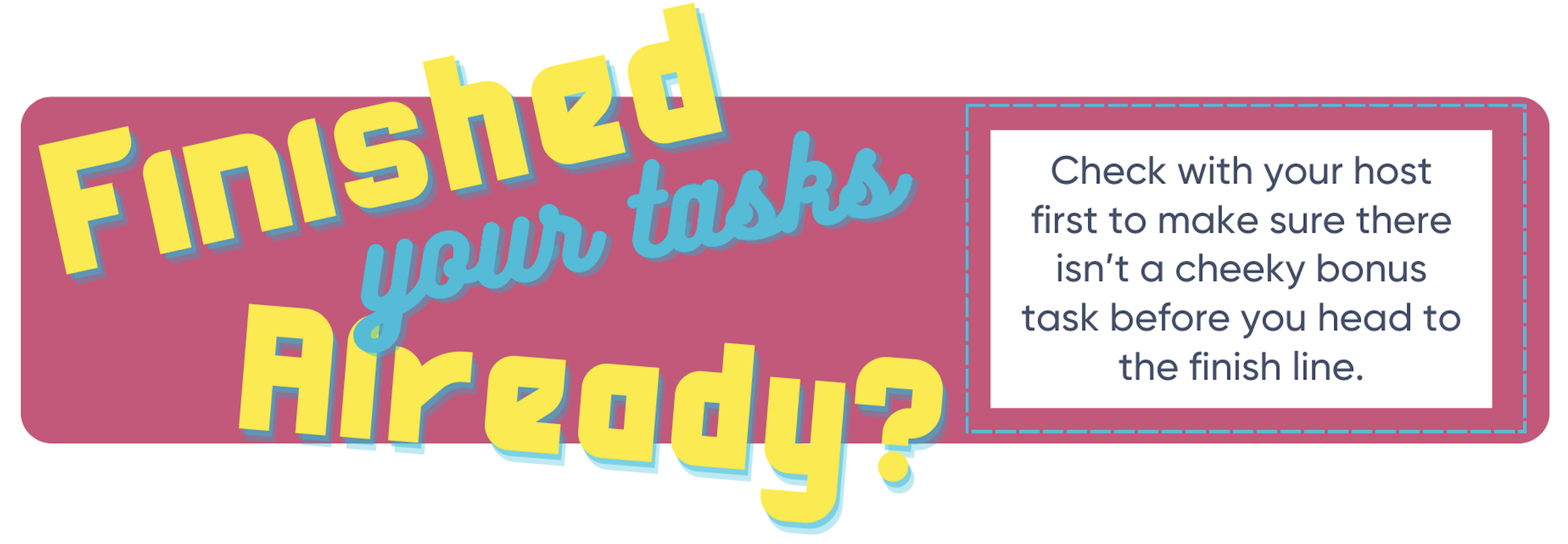 To deduct 20 minutes from your total race time, everyone on your team must cross the finish line wearing a fake moustache! (Check in with your host for these finish line details, there may be a Roadblock... )